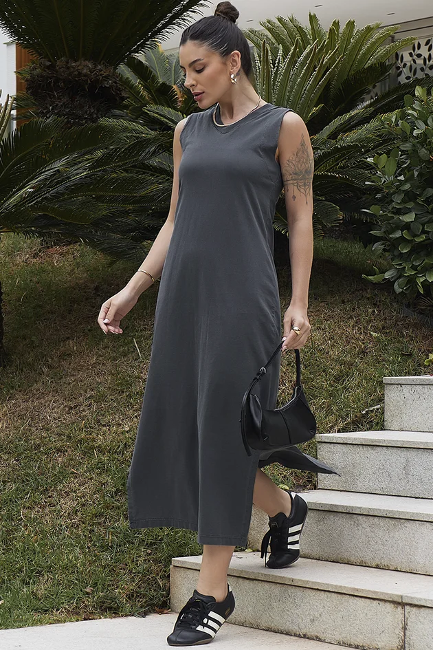 O Vestido Estonado Midi Regata Hiatto é a escolha ideal para quem busca frescor, conforto e estilo em uma única peça. Confeccionado em 100% algodão, possui toque macio e modelagem midi, reta e solta ao corpo, que garante liberdade e leveza nos movimentos. O decote em V com acabamento em ribana valoriza o colo e adiciona um toque moderno e feminino, enquanto o design sem mangas torna o modelo perfeito para os dias mais quentes.