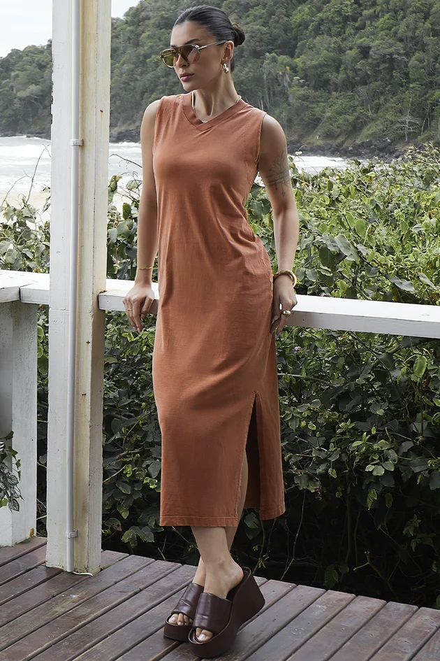 Com lavagem estonada em lavanderia, o vestido passa por um processo de abrasão suave e amaciamento, resultando em um toque delicado e uma aparência naturalmente despojada. O destaque fica por conta das fendas laterais, que acrescentam movimento e charme ao look. Um básico moderno e durável, pensado para quem valoriza conforto, autenticidade e qualidade em cada detalhe.